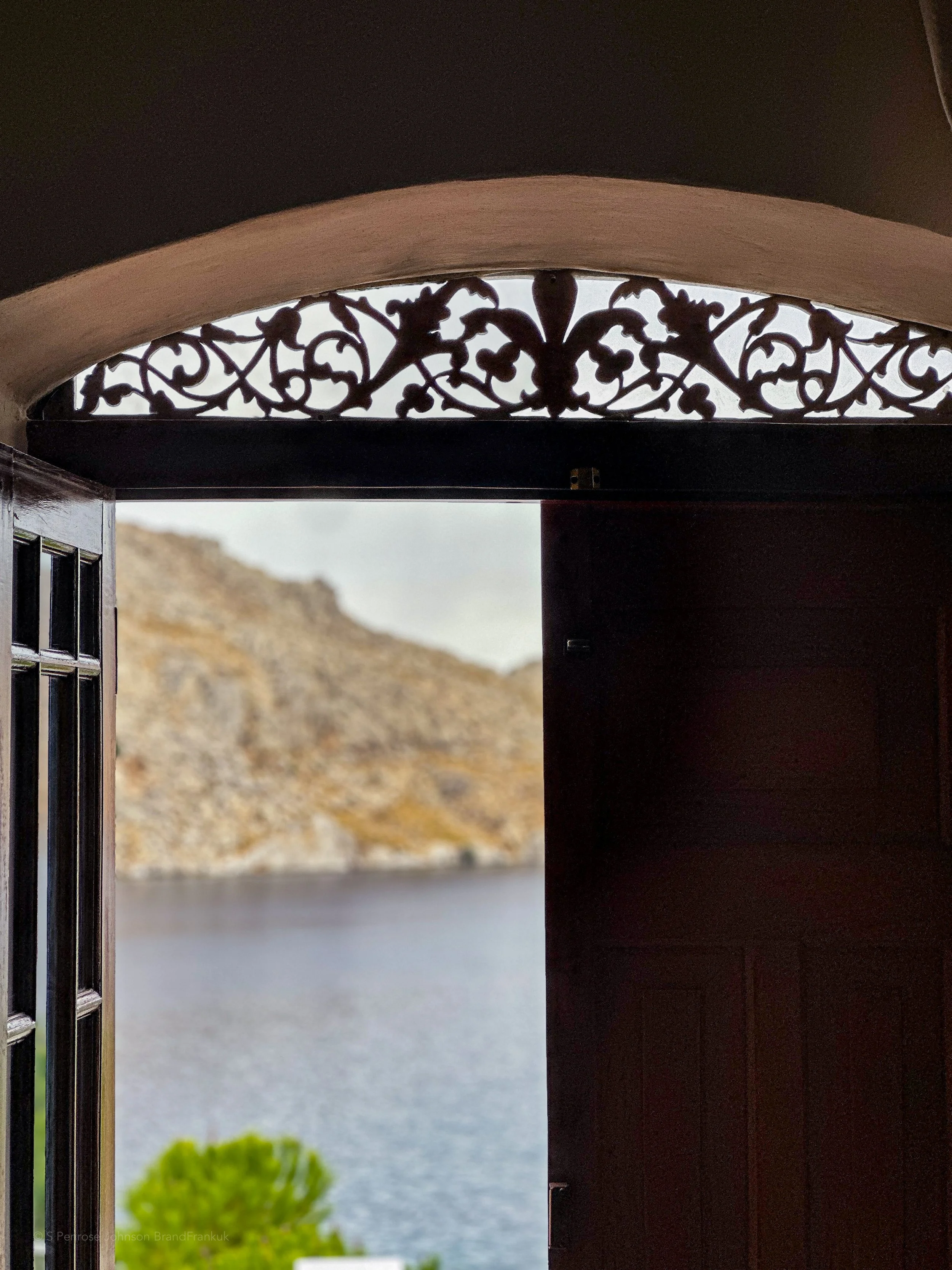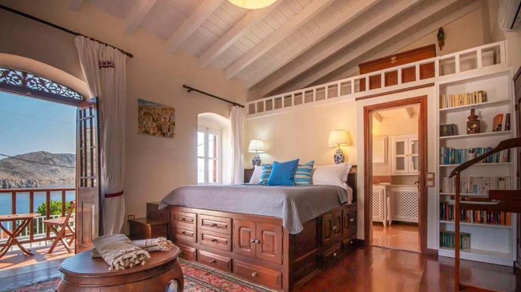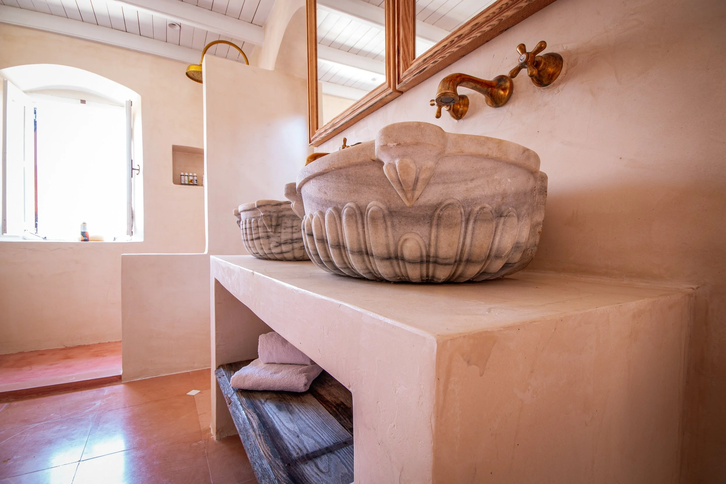 The beautiful bathroom is in traditional Patiti polished concrete, has double Greek marble sinks, brass finish taps and shower that has a window looking out to sea, a totally private view for you - and with a selection of Korres products; soaps, shampoo, conditioner and shower gel.