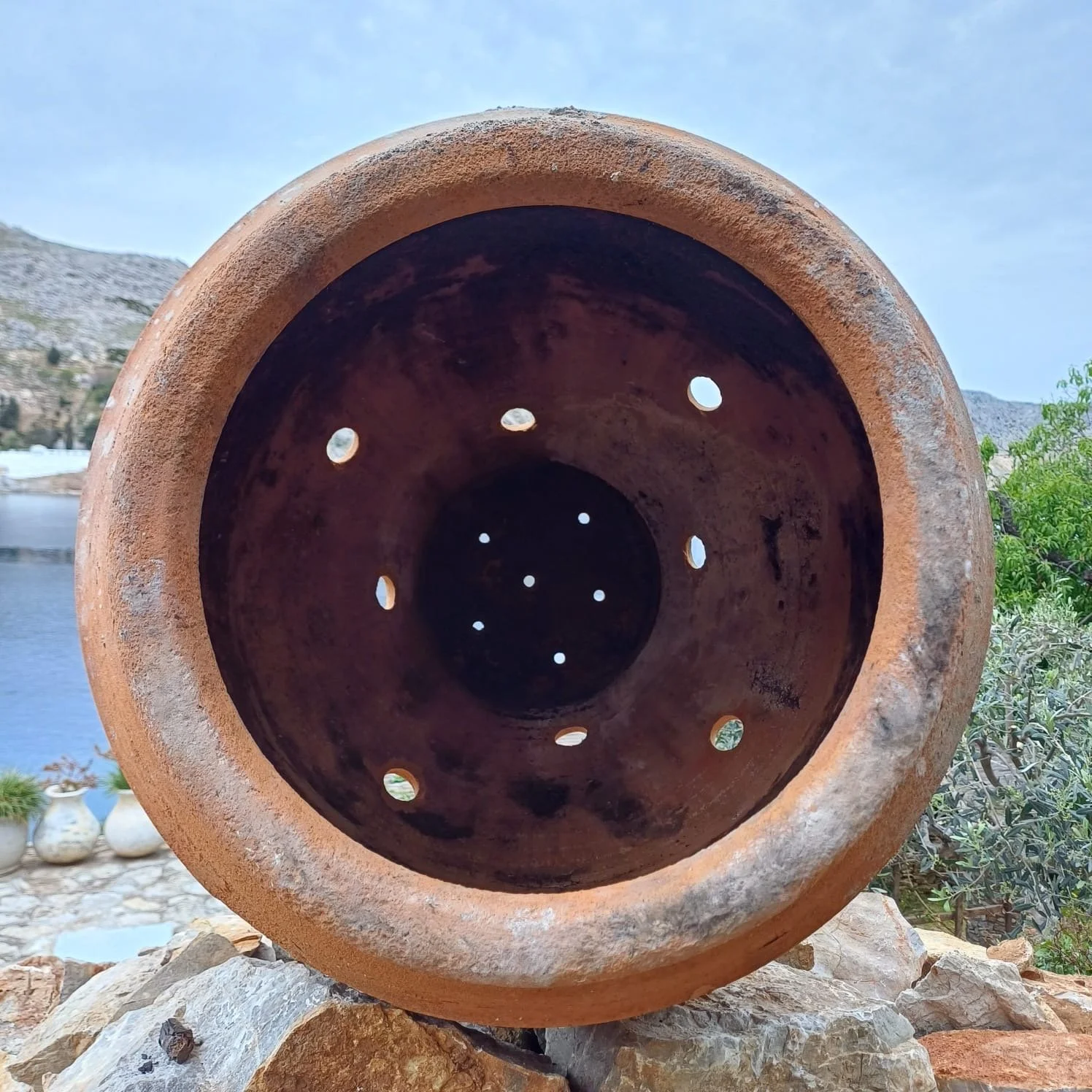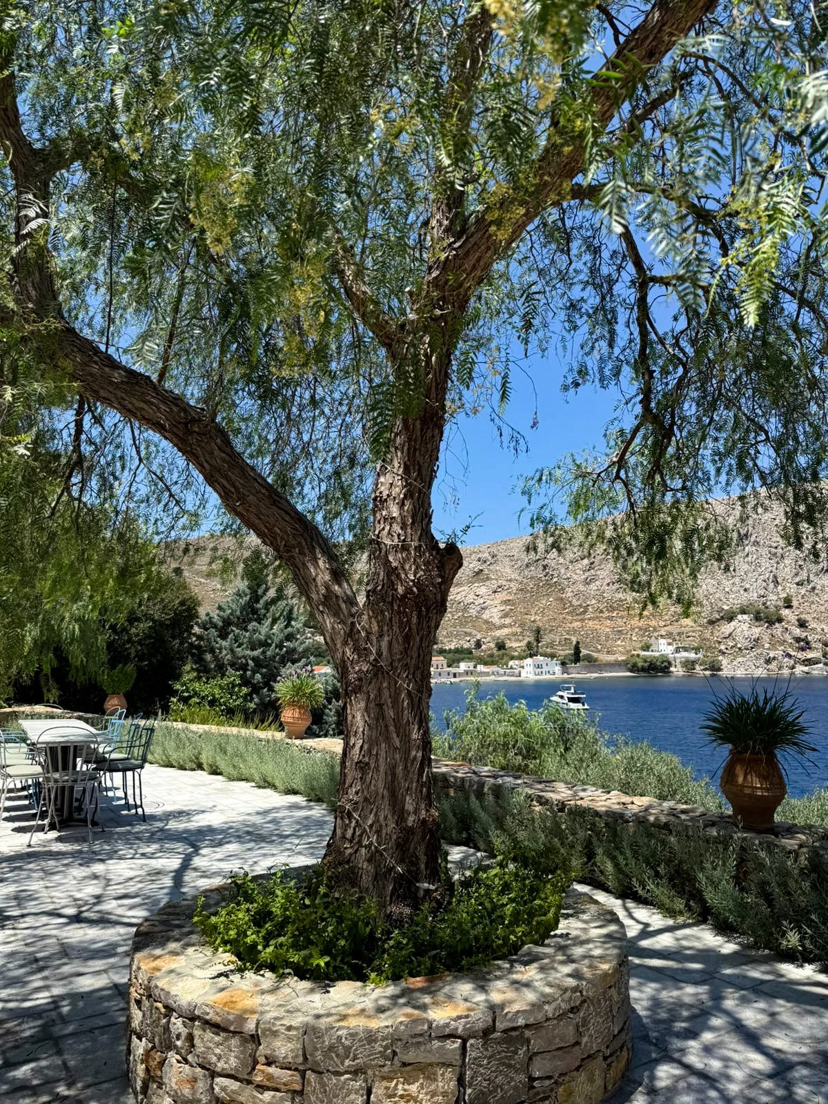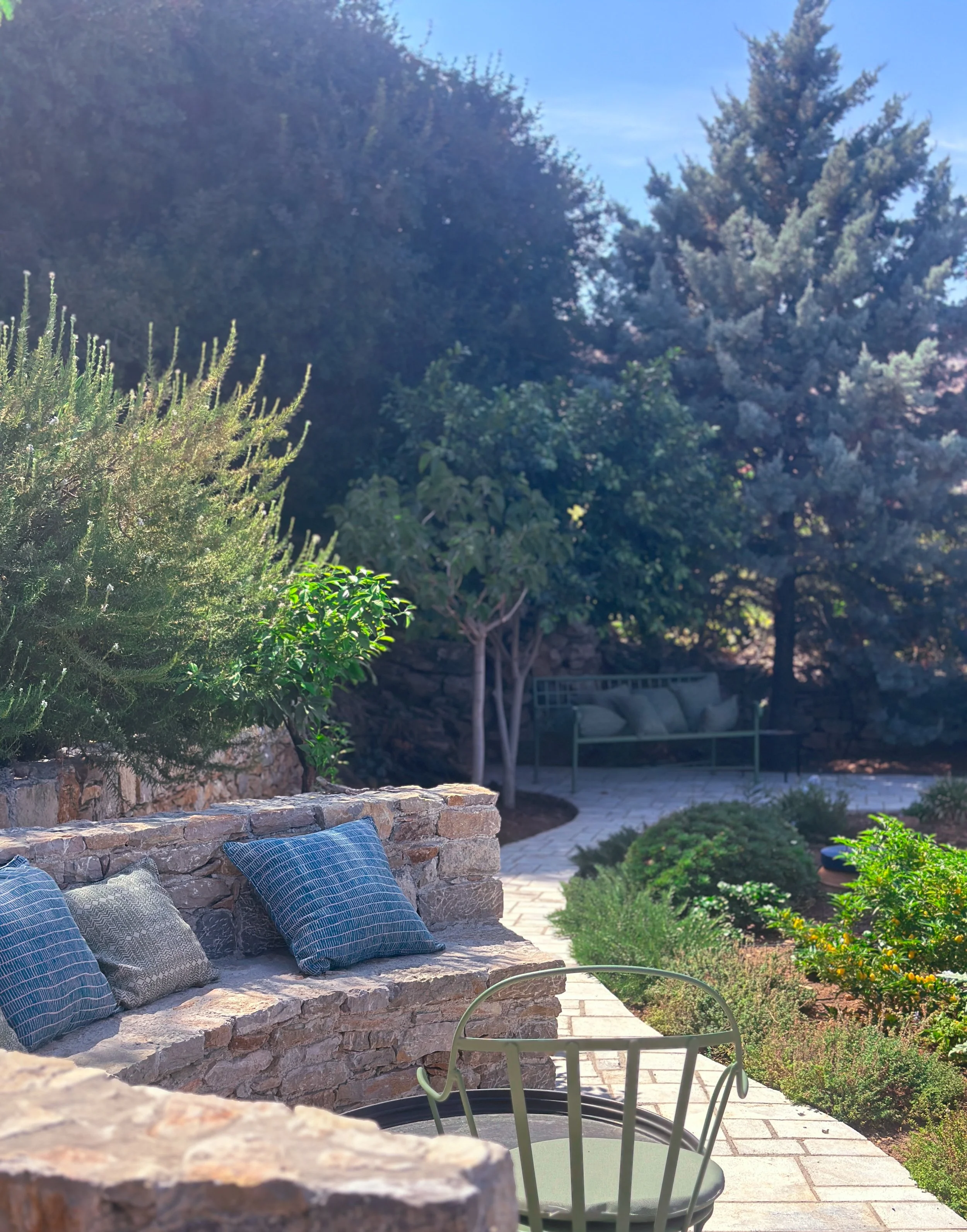 “I wanted the soil to be celebrated as the soul of this garden, alongside fragrant drought resistant planting & the sanctuary of cool dappled shade cradled by the ancient dry stone terrace walls. For Selene I researched and created a sustainable soil system based on my adaption of archaic methods. An integrated terracotta wormery system that I've called 'Amphora Composting' The amphora indigo lids sit in visual harmony with the terraces, the sea & the sky of Nimborio.